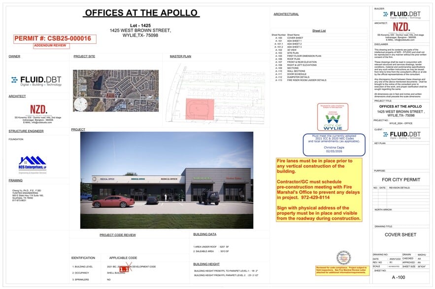 OFFICES AT THE APOLLO presents a rare, fully entitled, shovel-ready commercial retail/office development located at 1425 W. Brown Street on approximately ±0.854 acres. This offering includes 100% approved architectural and site plans from the City of Wylie, allowing vertical construction to begin immediately upon payment of building permit fees, eliminating the typical entitlement and design timeline and significantly accelerating time to market. The project is thoughtfully designed to accommodate 5 flexible retail or office suites ranging from approximately 1,030 to 1,090 square feet, ideal for a mix of professional services, medical, or neighborhood-serving retail users. The site benefits from strong surrounding demographics and proximity to key demand drivers including Collin College – Wylie Campus, Wylie City Hall, and major retail anchors such as Kroger Marketplace, Tom Thumb, and Home Depot. Zoned Neighborhood Service District (NS), the property supports a wide range of commercial uses designed to serve the surrounding residential base. This is an ideal opportunity for developers, owner-users, or investors seeking a low-risk, high-efficiency project with immediate execution potential in one of North Texas’ fastest-growing submarkets.