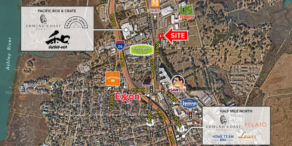 - Traffic Counts: Meeting Street Rd 13,900 AADT | King St Extension 10,000 AADT | I-526 90,000 AADT