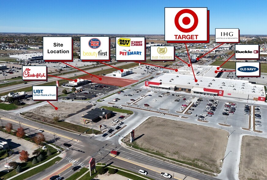 ? Conestoga Marketplace - Bail à long terme de 1,71 acre ? Target - Magasin de 150 000 pi² comprenant épicerie, vêtements, et autres commerces de détail ? 140 000 pi² d'espace de vente au détail national incluant : American Eagle, Bath & Body Works, B&B Theatres, Best Buy, Buckle, Carter’s, Glik’s, Maurices, Old Navy, PetSmart, Spencer's, Tradehome Shoes et plus encore ! ? Développement de 275 unités résidentielles de luxe ? Nouvel hôtel de marque IHG de 150 chambres - Ouverture en 2026 ? Nouveaux restaurants sur le marché ? Plus de 40 000 véhicules par jour (Hwy 281, 13th Street, Webb Road) ? Zone commerciale principale du centre du Nebraska
