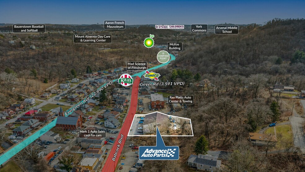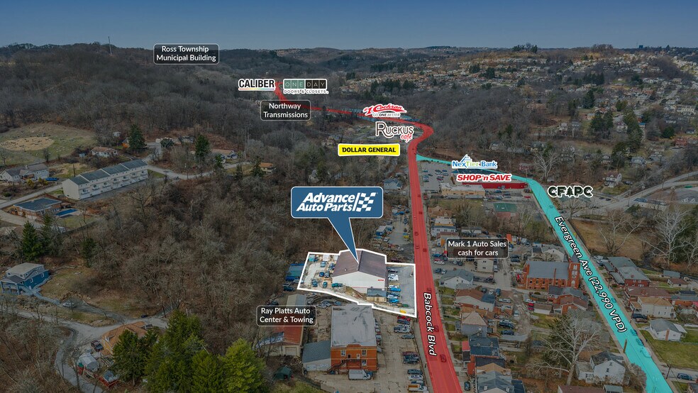 Sands Investment Group is pleased to exclusively offer for sale the 12,550 SF Advance Auto Parts located at 1445 Babcock Boulevard in Pittsburgh, PA. The property features a two-tenant auto service and retail asset occupied by Advance Auto Parts and Rick Britenbaugh Auto Body. Positioned along the highly trafficked Babcock Boulevard corridor, the site benefits from approximately 23,000 vehicles per day, strong surrounding population density, and excellent visibility. This strategic location provides consistent consumer traffic and long-term retail exposure, making it an attractive investment opportunity in a well-established automotive retail corridor.