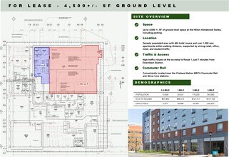 À louer : Jusqu'à 4 500 +/- SF APERÇU DU SITE : Rez-pied des suites Hilton Homewood avec stationnement 465 chambres d'hôtel accessibles à pied Densément peuplé Circulation intense sur une bretelle d'accès à la route 1 À 7 minutes du centre-ville de Boston Excellent mélange de commerce de détail, de bureaux, d'hôtels et de trafic étudiant Plus de 1 000 nouveaux appartements accessibles à pied À proximité de la gare de train de banlieue de Chelsea et de la station « T » Silver Line