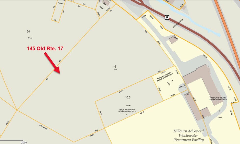 Development Site - NY/NJ Border; 9 Acres Development Site - near Major Highways - NY/NJ Border 9 Acres of raw land located on Old Route 17 and Interstate I-287, with 550 Ft frontage on Old Route 17. The property is in an Open Space Zoning District in the Village of Hillburn, however, as it is adjacent to the modern Hillburn Advanced Wastewater Treatment facility, right by the entrance to I-287 and near the NY Thruway - I-87, and Route 17 - other uses such as Industrial/Commercial might be Higher and Better uses. Utilities - Water, Gas, Electric, Sewer - on the street (Old Rte. 17) Studies show that the site contains an ore of Bluestone, and based on some opinions, the value of the Bluestone can offset the cost of the site development. This site is a mountainside and, depending on the intended use, might require excavation work, similar to the work done at the adjacent property owned by the Town of Ramapo. The owner will not sell “Subject To” (zone change, variances, approvals, etc.) and would only accept a Free, Clear, and Marketable Title contingency. An adjacent lot of 8.5 Acres in a Residential Zone district is also available.