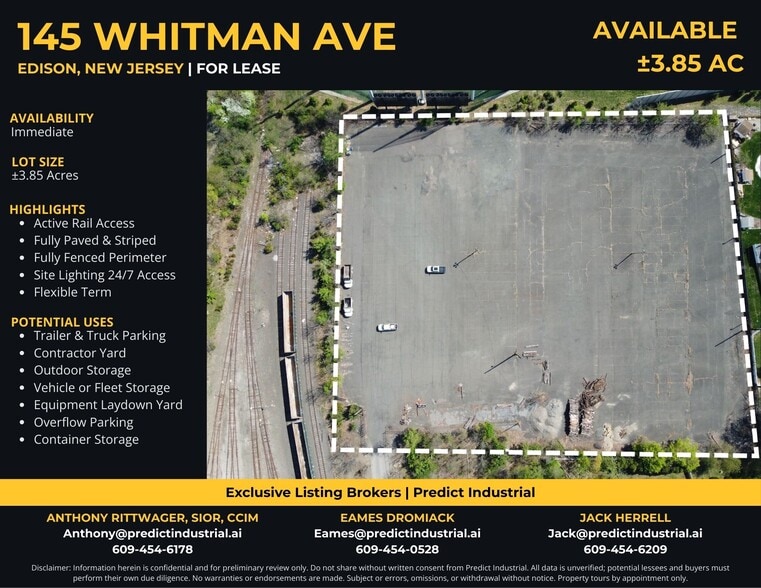 Property Details: www.advanceindustrial.com/145-whitman Rate: Please call for Lease Rate Property Type: Land Lot Size: ±3.85 Acres Description: Industrial Land Lease Term: Flexible Availability: Immediate Zoning: Light Industrial (L-I) Highlights: Fully Paved & Striped Fully Fenced Perimeter Site Lighting for 24/7 Access Active Rail Access Strategic Location: ±3 minutes to I-287 ±5 minutes to NJTP (10) ±9 minutes Route 27 ±15 minutes to GSP Dense industrial & retail corridor Rail Advantage Offers immediate access to an active rail line—ideal for companies that depend on efficient and reliable rail logistics. To know more about this property, visit: https://advanceindustrial.com/145-whitman