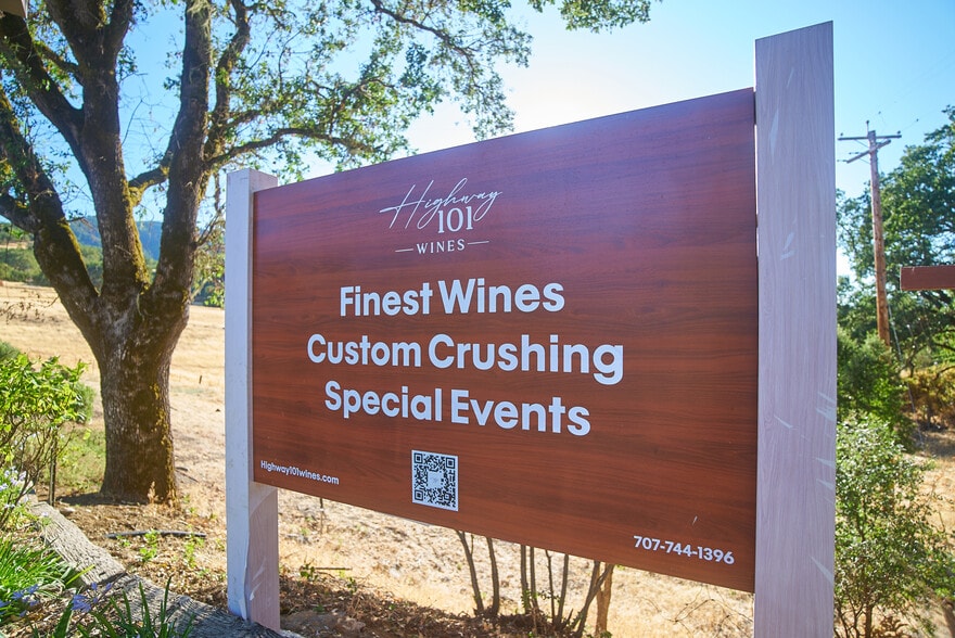 The centerpiece is a character-rich 8,000+ sq ft barn-style winery building featuring a tasting room, custom crushing capabilities, and a special events platform — fully licensed, equipped, and operational. New signage, a redesigned entry, and professional landscaping deliver strong Highway 101 visibility and drive-by traffic exposure.