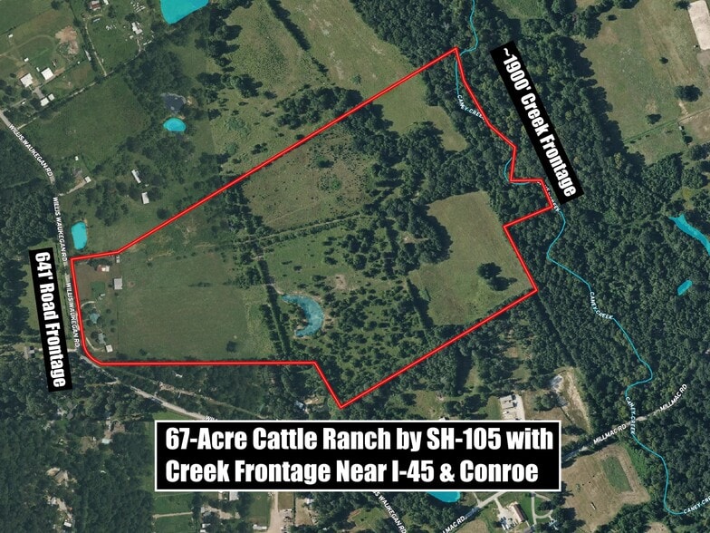 This 67+ acre Conroe-area ranch combines scenic live-water frontage with exceptional development potential. Featuring extensive road frontage, public water, and an active Ag exemption for low-tax holding, this versatile property is primed for residential, agricultural, or commercial redevelopment near major hubs. Four contiguous parcels, featuring approximately 1,900 ft of Caney Creek frontage, offer mature trees, unmatched scenic views, tranquility, and a high-value, functional investment. Whether for livestock, irrigation, or simply enjoying nature, this live-water source supports diverse wildlife habitats and provides unparalleled serenity. This fully equipped ranch for livestock, features cross-fenced pastures, a 0.5-acre pond, a 40'x 60’ metal horse barn with 4 stalls, 40’ x 50’ metal hay barn with 20’ x 40’ run-in shed, storage shed with chicken coop, cattle chutes, 1,244 sqft brick ranch home and a second manufactured home with detached garage (both with independent septic systems). It has a massive 640 feet of frontage on Willis Waukegan Road, a high-traffic connector for SH-105 & I-45 with superior logistics: 7.5 miles to Conroe, 10 miles to Willis, and 18 miles to The Woodlands. Whether you’re dreaming of a secluded country estate, a premier retreat, an agricultural investment, a master-planned community, or a commercial business, this versatile acreage offers natural features and a strategic location near major highways and urban amenities.