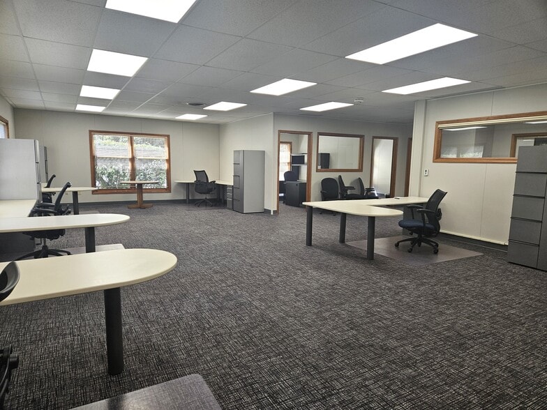 Over 2,100 square feet of office space for lease, featuring four private offices, a conference room, and an open area with desks for five to eight employees. The building provides secure entry and ample parking.