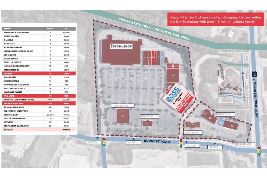| Superficie totale disponible | 11 680 pi² | Façade | 1 351’ le Dutchess Turnpike |