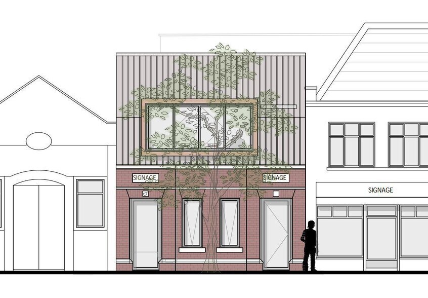 La propriété bénéficie d'un consentement de planification pour réaménager l'ancien immeuble de commodité publique du rez-de-chaussée avec un agrandissement du premier étage afin de fournir une unité commerciale de deux étages (utilisation proposée de catégorie E), en conservant l'arbre existant et les travaux externes connexes. L'édifice existant mesure environ 300 pieds carrés et le développement proposé offrira 527 pieds carrés d'espace commercial.
