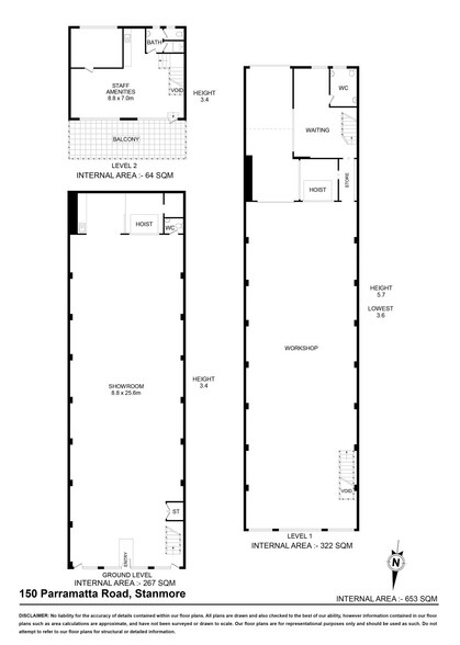 The property at 150 Parramatta Road, Stanmore, is a three-level building totaling 653 m²*. It includes a ground floor showroom, a first-floor workshop, and a second-floor caretaker unit. The site has dual street frontage, rear lane access, and is located approximately 6 km from the Sydney CBD. It is accessible via Parramatta Road and City West Link. The property is council-approved for mechanical workshop use and includes a goods hoist and additional mezzanine storage.