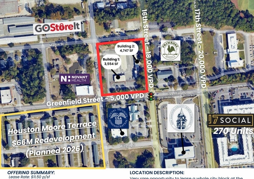Very rare opportunity to lease a whole city block at the signalized intersection of 16 Street and Greenfield Street with over 20,000 VPD at the intersection. The property is located just south of Downtown Wilmington and near Novant Hospital which has over 2,000 employees. Additionally, it is adjacent to the South Front District and Greenfield Lake Amphitheater