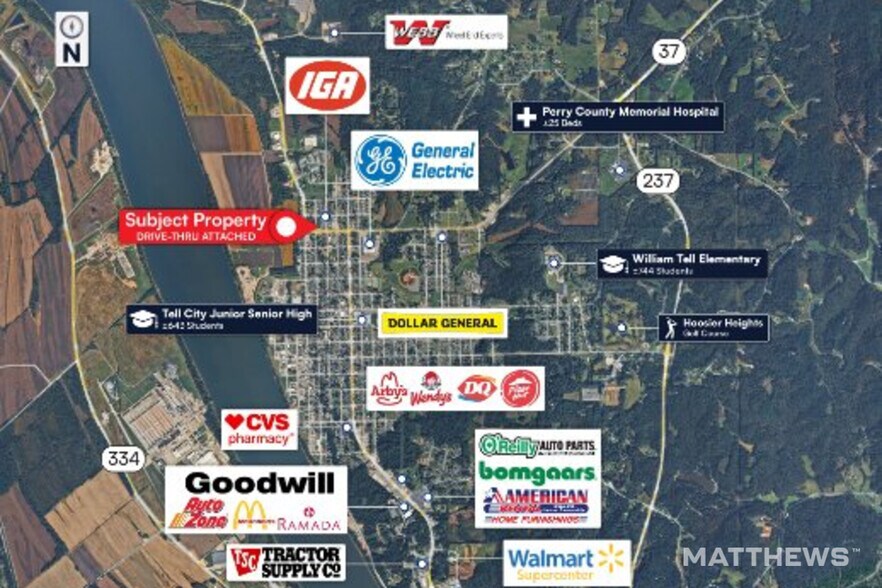 - Property Overview: Vacant freestanding brick building with existing drive-through infrastructure — a rare value-add feature in the Tell City market. F