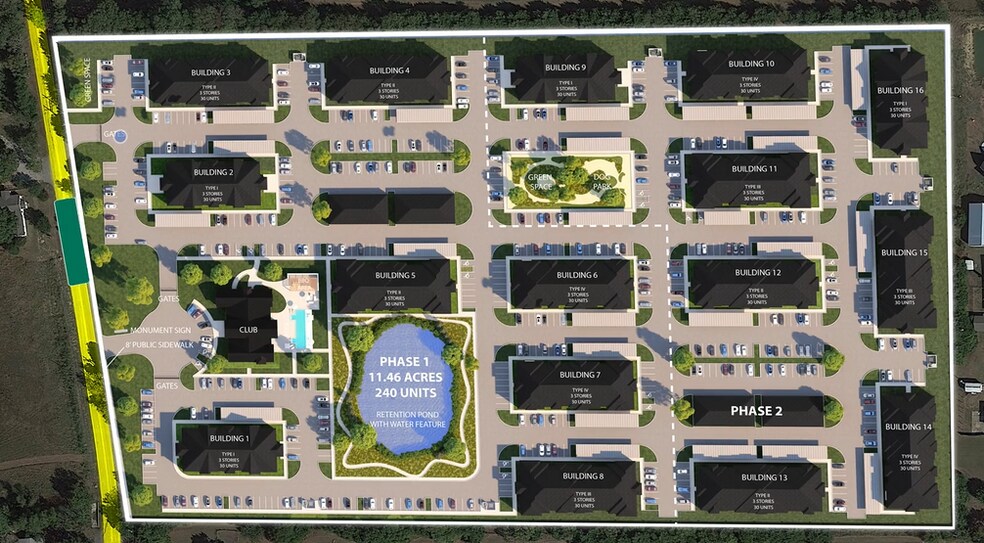 PROJECT DETAILS: Proposed Use Garden-Style Multifamily Design Status 100% CDs Unit Count 480 Units (23/AC) Buildings 16 Residential, 1 Clubhouse Stories 3 floors above grade Gross Building Area 554,052 sf Net Rentable Area 424,392 sf Ceiling Height 9' Parking Provided 915 Spaces