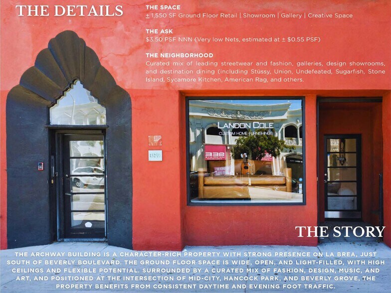 The Archway Building presents a rare opportunity to lease a character-rich retail, showroom, or creative space along the iconic La Brea corridor. Positioned just south of Beverly Boulevard, the property offers exceptional visibility on one of Los Angeles’ most dynamic retail streets. The ±1,550 SF ground floor space is wide, open, and filled with natural light, featuring high ceilings and a flexible layout suited for retail, gallery, showroom, or creative use, with below-market NNN expenses estimated at ±$0.55 PSF. Surrounded by a curated mix of leading fashion, design, and dining including Stüssy, Union, Undefeated, Stone Island, Sugarfish, and Sycamore Kitchen, the location sits at the intersection of Mid-City, Hancock Park, and Beverly Grove, benefiting from strong daytime and evening foot traffic. An ideal opportunity for an operator seeking presence and alignment within one of Los Angeles’ most culturally relevant retail corridors.