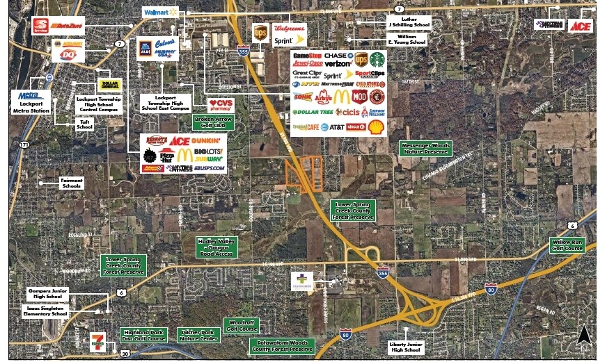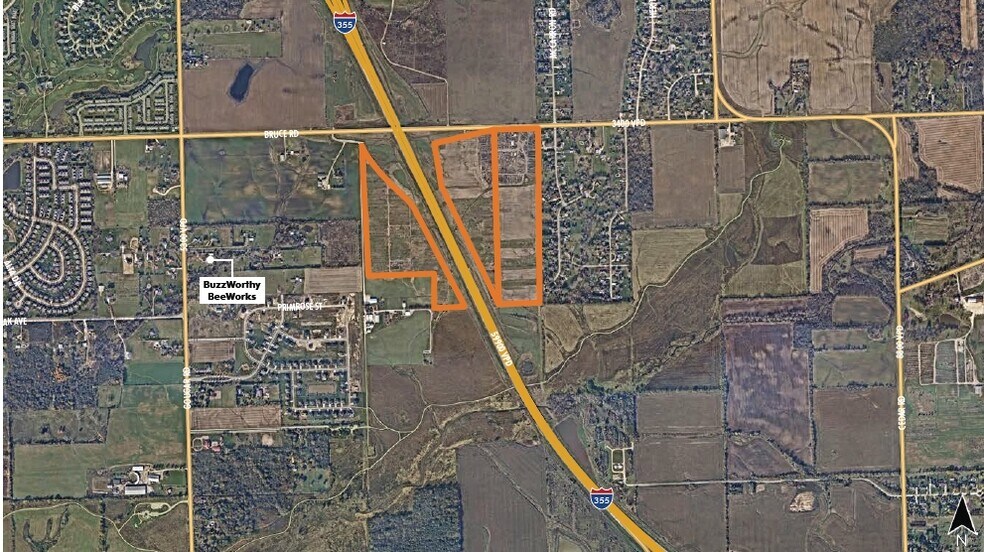The offering consists of approximately 105.55 acres of land that is currently unincorporated and planned for a mix of retail, commercial, and industrial/business park uses. The site benefits from excellent regional exposure with direct visibility and access from I-355, supported by strong traffic counts of approximately 59,900 vehicles per day on I-355 and 3,400 vehicles per day along Bruce Road. The property includes multiple parcels (16-05-32-200-003, 16-05-32-200-009, and 16-05-32-200-010) and carries annual real estate taxes of $7,960. Additional information is available upon request.