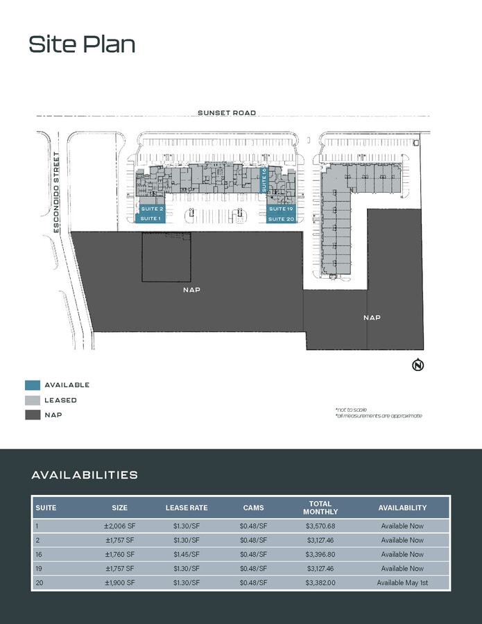 Suite 20 is a ±1,900 SF unit featuring 100% HVAC, ±1,500 SF Office, ±400 SF Warehouse, three (3) Private Offices, Reception, Conference Room, Workroom, Kitchenette Space with Sink, one (1) Restroom, Sprinklered, Gas available, with 120/208v, 3-phase power (tenant to verify). LEASE RATE: $1.30/SF (NNN); CAMs: $0.48/SF; TOTAL MONTHLY: $3,382.00; AVAILABLE May 1st, 2026. For more information or to schedule a tour, please contact Kyle Kirchmeier at 702-369-4862 or Alex Stanisic at 702-369-4874.
