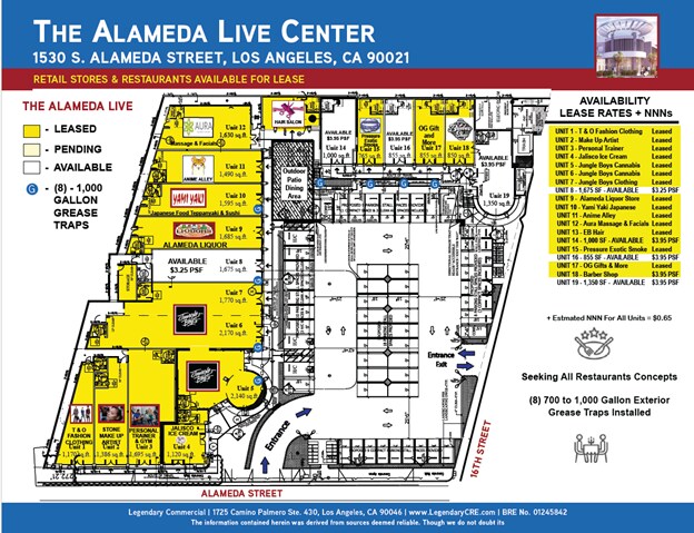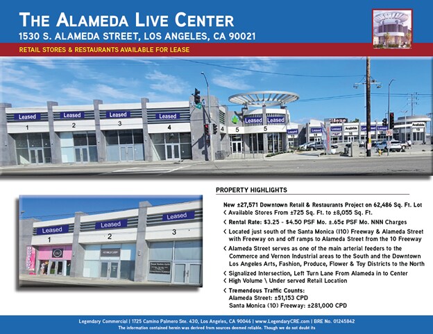 Legendary Commercial Realestate est ravi d'annoncer l'autorisation exclusive de location pour le nouveau projet de commerces de détail et de restaurants au centre-ville, d'une superficie de ±27,571 pieds carrés, connu sous le nom de Alameda Live Shopping Center. Le centre est situé sur un terrain de 62,486 pieds carrés. Il reste 6 locaux disponibles! Les superficies varient entre ±850 pi², 855 pi², 1,000 pi², 1,120 pi², 1,350 pi², 1,675 pi² ou 2,200 pi² si les unités de 800 pi² et 1,350 pi² sont combinées. Les loyers sont fixés à $3.25, $3.95 et $4.50 par pied carré par mois, avec des frais NNN de ±0.65¢ par pied carré par mois. Le centre est idéalement situé juste au sud de l'autoroute Santa Monica (I10) et de la rue Alameda, avec des rampes d'accès et de sortie directement sur la rue Alameda depuis l'autoroute 10. La rue Alameda est l'une des principales artères reliant les zones industrielles de Commerce et Vernon au sud, ainsi que les districts des arts, de la mode, des produits frais, des fleurs et des jouets du centre-ville de Los Angeles au nord. Le centre est situé à une intersection avec feux de signalisation, incluant une voie de virage à gauche depuis la rue Alameda directement vers le centre. Il bénéficie d'un trafic élevé et d'une excellente visibilité. Données impressionnantes sur le trafic : Rue Alameda : ±51,153 véhicules par jour (CPD) Autoroute Santa Monica (10) : ±281,000 véhicules par jour (CPD)