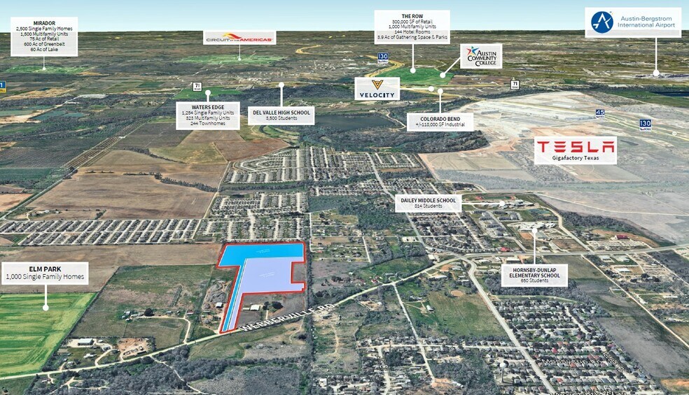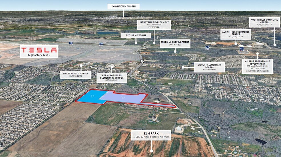 The property consists of two tracts totaling 36.56 acres. It is located within the Austin Extra Territorial Jurisdiction and has access to water and wastewater utilities provided by Hornsby Bend. The site is situated east of State Highway 130 and near US-183, approximately 10 miles from Downtown Austin and 6 miles from Austin-Bergstrom International Airport. The surrounding area includes ongoing industrial, residential, and commercial development, including the Tesla GigaTexas facility.