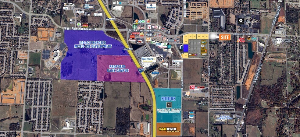 This ±2.76-acre level tract offers an exceptional opportunity for commercial development in the rapidly growing City of Lowell, Arkansas. Situated on a hard corner at Pleasant Grove Rd. with a traffic signal and featuring excellent visibility and access, the property benefits from high traffic counts and strong surrounding growth. Priced at $980,100 per acre ($22.50 per square foot), the site also offers possible build-to-suit opportunities for qualified tenants or users. Currently zoned R-1, the site is designated for C-2 zoning in the City of Lowell’s Future Land Use map, presenting a clear path for commercial use. Ideally located less than a mile from Interstate-49 and Highway 71B, this parcel is surrounded by several new multifamily neighborhoods, retail centers, and restaurants—creating a vibrant trade area with consistent consumer activity. With new developments continuing to expand in every direction and its proximity to major employment and retail hubs such as Pinnacle Hills in Rogers, this site offers prime