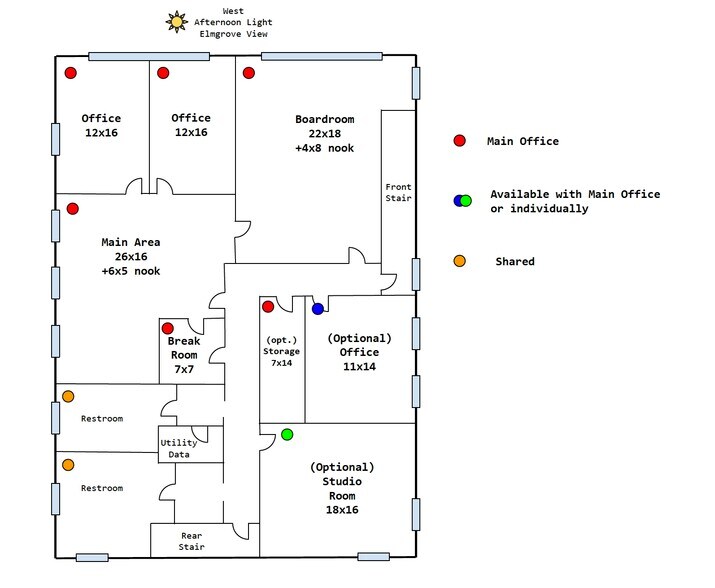 2nd Floor Office Space available above The Butcher Shop Deli. Multiple office suite/meeting room configurations possible to suit your needs. Highly accessible and charming East Side location with fun neighborhood vibes. Very walkable to food and shops with a bus stop directly across the street. Street parking only.