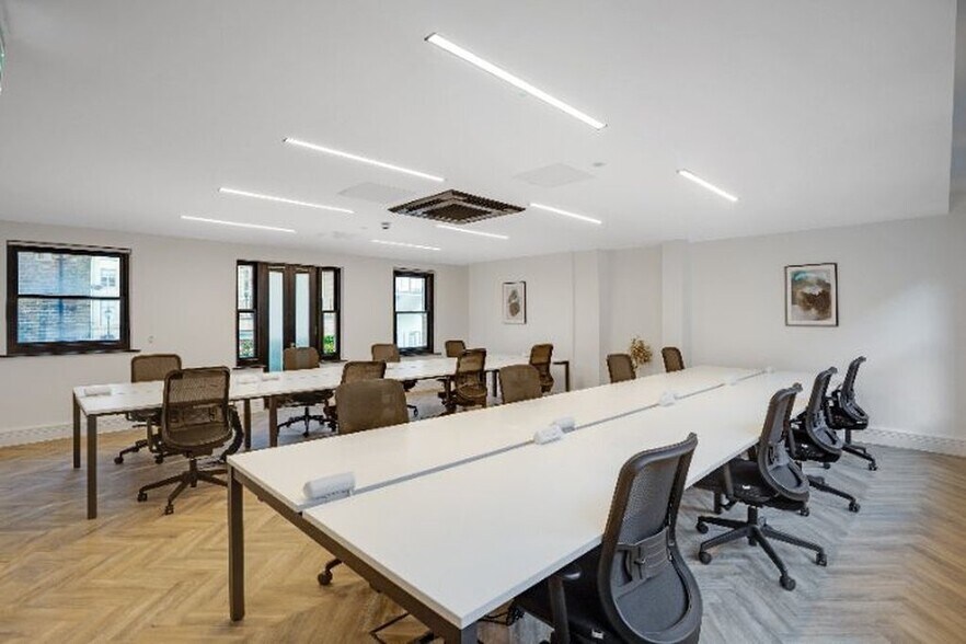 This newly refurbished second-floor office at 16 D'Arblay Street offers a modern, self-contained workspace in the heart of Soho. The building features a lift and a welcoming entrance, with high-quality finishes throughout. The available floor includes 16 desks, two meeting rooms (6-person and 4-person), a kitchenette, breakout space, welcome area, two call pods, and a small balcony. A shower is also available on the floor.