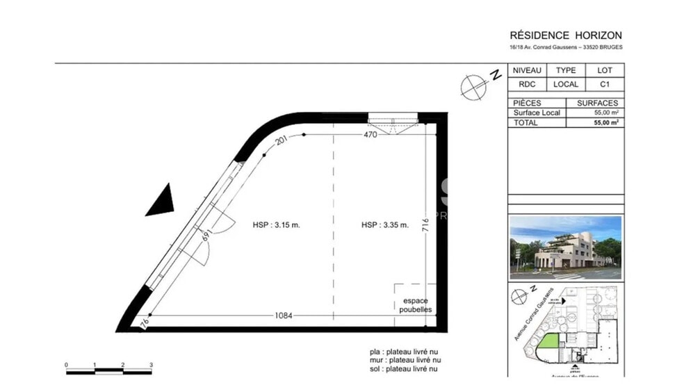 EVOLIS est heureux de vous présenter une opportunité d'acquisition rare à Bruges, Ces espaces, idéalement situés en pied d'immeuble, jouissent d'une localisation stratégique à proximité immédiate du centre-ville et de la rocade, au sein d'un projet immobilier en cours de construction. Plusieurs surfaces disponibles : 55 m², 70 m² et 250 m², ces bureaux assurent une accessibilité optimale et une visibilité accrue dans un environnement en pleine expansion. Saisissez cette occasion unique de vous établir dans un cadre moderne et fonctionnel. ERP Locaux neufs Locaux livrés brut de béton Entrée indépendante Surface RDC : 375 m² Situation/Transports : SNCF Bruges (Gare SNCF) Bus Martyrs de la Résistance (Ligne 29), Avenue de l'Europe (Ligne 35, Ligne 72)
