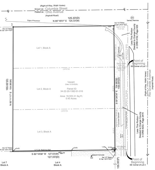 The lot is 0.45 acres (roughly 154’ x 127’). It is under re-zone for commercial use (car dealer, auto repair, and other), Orange County. The property has a corner location at Rio Grande Avenue South.