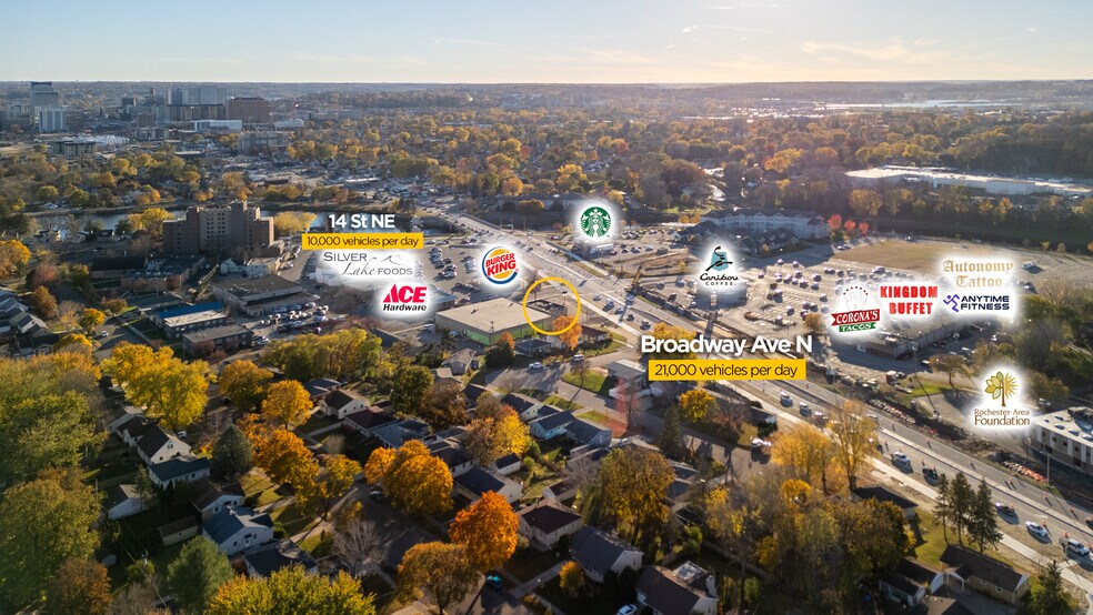 This iconic 1,292 sq. ft. standalone commercial building is now white-boxed and ready for your custom build-out. Perfectly positioned on a high-traffic corridor with over 21,000 cars passing daily, this location offers unparalleled brand exposure for retail, professional office, or service-based businesses. The property features a prominent pylon sign for maximum street-level marketing and convenient front-door parking for clients and staff. Located just north of Downtown Rochester and the Mayo Clinic district, this site combines the autonomy of a free-standing building with the accessibility of a central urban hub. Skip the demolition and start fresh in a clean, open space designed to bring your business vision to life today! Key Highlights: - Ultimate Visibility: Benefit from a massive daily traffic count of over 21,000 vehicles. Your brand will be seen by thousands of commuters heading into Downtown Rochester and the Mayo Clinic district daily. - Maximum Branding: High-impact pylon signage on the corner and additional building signage opportunities ensure your business stands out from the crowd. - Move-In Ready: The interior is freshly white-boxed—clean, open, and waiting for your vision. No demo, no mess—just bring your flooring and finishes. - Easy Access: Features front-door parking and a dedicated paved lot with roughly 15–20 spaces, a rare find for a Broadway-facing property.
