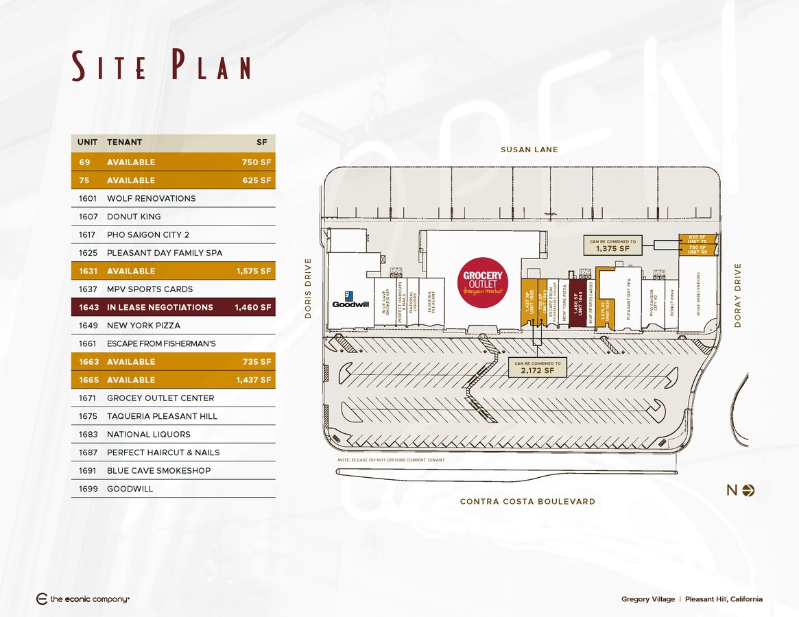 Gregory Village Shopping Center 1601-1699 Contra Costa Blvd 625–6 582 pi² d'espace disponible • Commerce de détail • Pleasant Hill, CA 94523