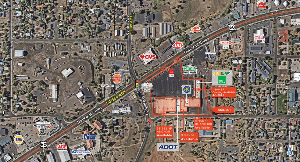 Deuce of Clubs Shopping Center offers a prime retail leasing opportunity in the heart of Show Low, Arizona. Positioned at the hard corner of Deuce of Clubs and Central Avenue, this center benefits from exceptional visibility and access along the city’s main commercial corridor. The property features multiple availability options, including large anchor and junior anchor spaces, as well as smaller inline suites, accommodating a wide range of retail concepts. The center is surrounded by a strong mix of national and regional tenants, including Family Dollar, O’Reilly Auto Parts, Rent-A-Center, H&R Block, and Subway, creating a steady flow of consumer traffic. With over 26,000 vehicles per day at the intersection and an average household income exceeding $84,000 within a three-mile radius, the location provides a robust customer base. Show Low serves as the largest city in the White Mountains and a regional hub for commerce, tourism, and services, drawing from a trade area population of more than 90,000. The property’s strategic location, combined with ample parking and excellent ingress/egress, makes it an attractive choice for retailers seeking strong market exposure and growth potential.