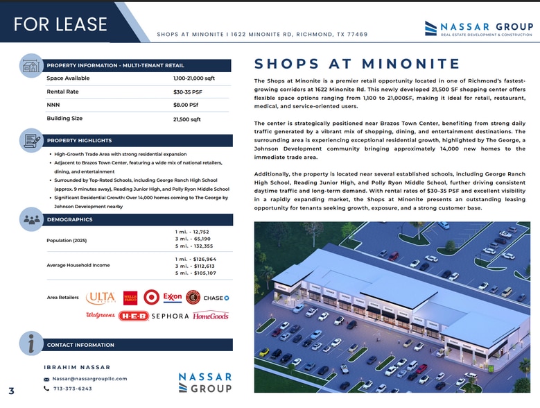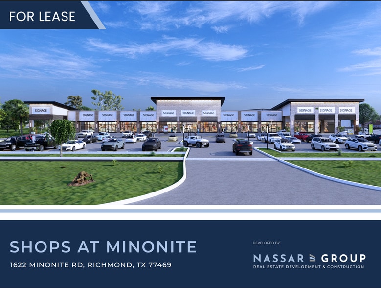 The Shops at Minonite is a premier retail opportunity located in one of Richmond’s fastest-growing corridors at 1622 Minonite Rd. This newly developed 21,500 SF shopping center offers flexible space options ranging from 1,100 to 21,000 SF, making it ideal for retail, restaurant, medical, and service-oriented users. The center is strategically positioned near Brazos Town Center, benefiting from strong daily traffic generated by a vibrant mix of shopping, dining, and entertainment destinations. The surrounding area is experiencing exceptional residential growth, highlighted by The George, a Johnson Development community bringing approximately 14,000 new homes to the immediate trade area. Additionally, the property is located near several established schools, including George Ranch High School, Reading Junior High, and Polly Ryon Middle School, further driving consistent daytime traffic and long-term demand. With rental rates of $30–35 PSF and excellent visibility In a rapidly expanding market, the Shops at Minonite present an outstanding leasing opportunity for tenants seeking growth, exposure, and a strong customer base.