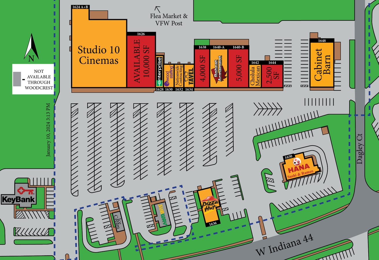 Junction Plaza, au 1624-1650 E State Road 44, est un centre commercial animé d'environ 74 000 pieds carrés situé à la périphérie de la région métropolitaine d'Indianapolis. Diverses suites d'une superficie en pieds carrés sont disponibles, prêtes à accueillir une variété d'utilisateurs, des devantures de magasins traditionnels et des restaurants aux bureaux pour les locataires de bureaux médicaux ou autres professionnels. Ancré par Studio 10 Cinemas et arborant une Pizza Hut, un restaurant japonais et un restaurant favori local, Cholula Mexican Restaurant, ce centre récemment acquis se trouve au cœur du quartier commercial desservant la région en pleine croissance de Shelbyville. Bien en vue sur l'Indiana State Highway 44 à Shelbyville, la propriété offre une visibilité incroyable et une connexion harmonieuse entre le centre-ville de Shelbyville et l'Interstate 74. Junction Plaza est facilement accessible par plusieurs points d'entrée et de sortie et offre un grand parking sur place à quelques pas de chaque devanture. Shelbyville est une communauté de banlieue confortable située à environ trente milles au sud-est d'Indianapolis, pleine de bâtiments historiques magnifiquement préservés, de quartiers pittoresque et d'un quartier vintage du centre-ville. Ce quartier animé offre aux résidents et aux visiteurs une vaste collection d'équipements et de commodités, le tout à portée de la plus grande ville de l'Indiana. Woodcrest Capital accueille les entreprises nouvellement créées et franchisées dans ses centres avec des contrats de location faciles à lire et des conditions souples tout en étant suffisamment sophistiqués pour plaire au plus grand des locataires de crédit nationaux. En tant qu'entreprise familiale avec plus de 40 ans d'expérience dans l'immobilier commercial, Woodcrest possède et exploite tout, des centres de classe A dans les quartiers les plus fréquentés aux centres en difficulté qu'elle réhabilite dans les communautés rurales en difficulté. Appelez dès aujourd'hui pour trouver le bon emplacement pour votre entreprise, car Woodcrest offre généralement de multiples possibilités de vente au détail dans la région immédiate.