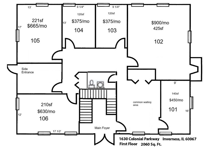 | 1er étage, ste 103 | 120 pi² | 1-3 ans | 51,04 $ CAD/pi²/an 4,25 $ CAD/pi²/mois 6 125 $ CAD/an 510,44 $ CAD/mois | Bureau | - | 2026-05-01 |
