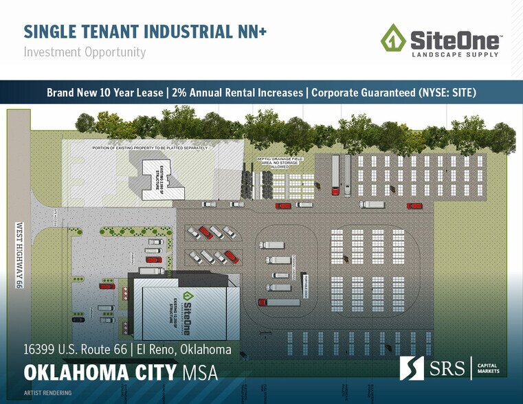 SRS National Net Lease is pleased to offer the opportunity to acquire the fee simple interest (land & building ownership) in a new construction, corporate guaranteed (NYSE: SITE | S&P: BB), SiteOne Landscape Supply investment property located in El Reno, Oklahoma (Oklahoma City MSA). The tenant, SiteOne Landscape Supply, LLC, recently signed a brand new 10 year lease with 3 (5-year) options to extend, demonstrating their commitment to the site. The lease features 2% annual rental increases throughout the initial term and each option period, providing a strong hedge against inflation. The lease is NN+ with limited landlord responsibilities making it an ideal, low-management investment opportunity for a passive investor. SiteOne is a premier provider in the landscape supply industry, boasting a market capitalization of nearly $6.5 billion and an extensive network of over 690 locations nationwide. The property is situated on a large 9+ acre parcel, featuring approximately 2.75 acres of outdoor storage, providing ample space for equipment, inventory, and operational flexibility.