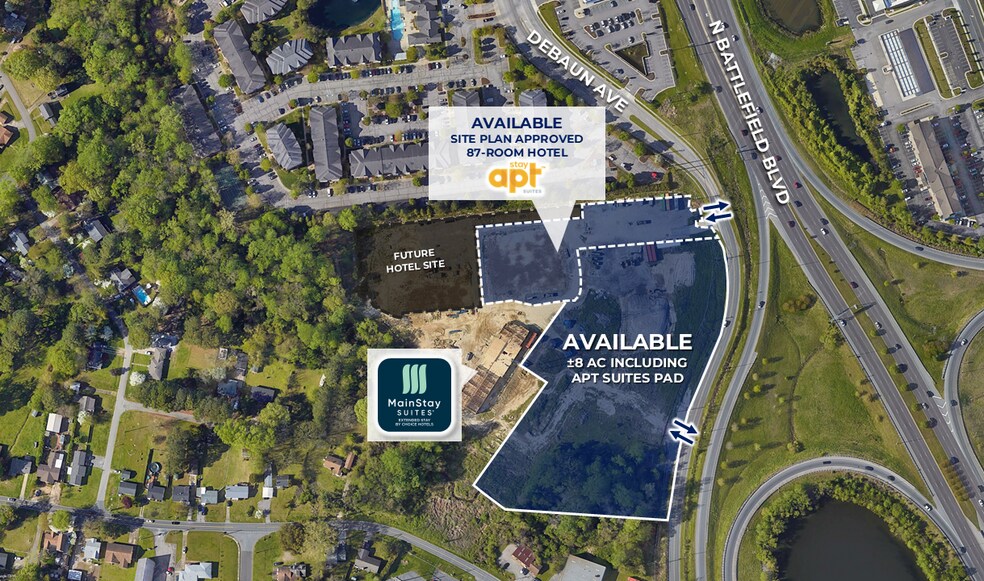 1664 Debaun Avenue presents a premier ±8-acre for-sale development opportunity in Chesapeake’s highly sought-after Greenbrier Business District, offering approved outparcel and hotel pads with exceptional visibility and access. The site includes a ±2-acre hotel pad with an approved site plan for an 87-room StayAPT Suites apartment-style hotel, along with additional flexible pads ideal for single- or multi-tenant commercial development. Positioned directly across from Kroger Marketplace and benefiting from approximately 70,000 VPD on Battlefield Blvd and 90,000 VPD on I-64, the property is surrounded by major employers, dense retail, and regional demand drivers, making it a compelling opportunity for hotel, retail, or mixed-use development in one of Hampton Roads’ strongest commercial corridors.