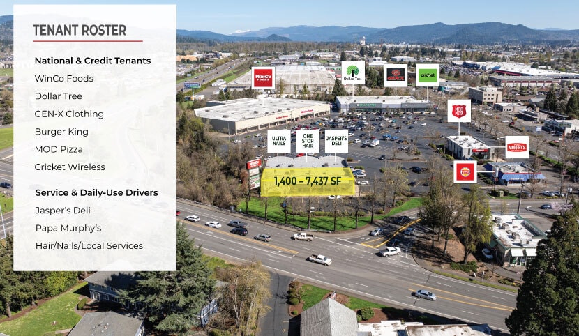 Springfield Retail Center is a well-positioned, grocery-anchored retail asset located along Mohawk Blvd, one of Springfield’s most heavily trafficked commercial corridors. Shadow-anchored by WinCo Foods, the property benefits from consistent daily-needs traffic and a proven retail environment supported by national and regional co-tenancy. The center offers flexible suite configurations from ±1,400 SF to 7,437 SF, accommodating a range of retail and service users. Strong visibility, direct access, and proximity to Hwy 126 and I-105 provide excellent regional connectivity, while surrounding residential density supports long-term tenant demand and stable performance.