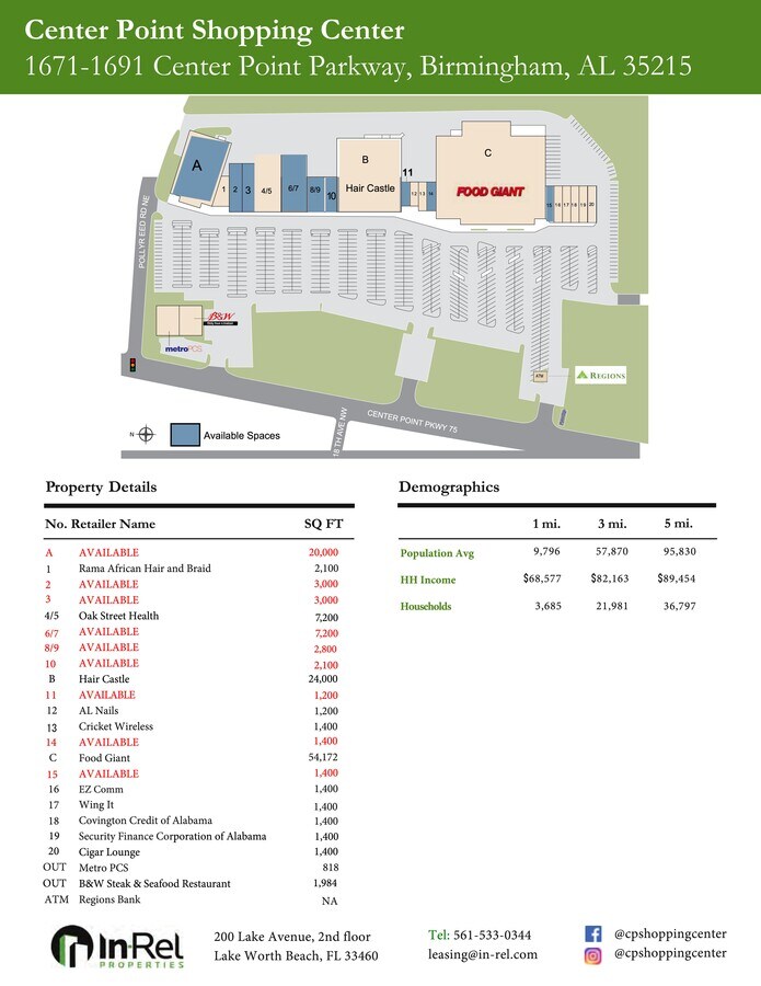 Center Point Shopping Center 1671-1691 Center Point Pky 1 200–34 900 pi² d'espace disponible • Birmingham, AL 35215