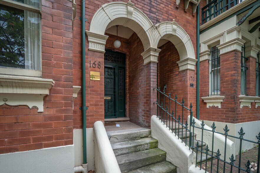 The property at 168 Pacific Highway, North Sydney, is a two-level office terrace with internal amenities including a kitchenette, bathroom with shower, and storage. It provides four car spaces at the rear and is located within walking distance of North Sydney Train Station and the planned Metro Station. The surrounding area includes retail and dining options.