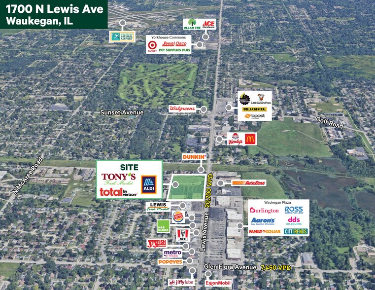 - Deux emplacements disponibles en face de l'avenue Lewis - Ancré par Tony's Fresh Market, American Freight et Aldi - Points d'accès multiples - 4 coupes de trottoir sur l'avenue Lewis, dont 2 points d'accès complets avec feu de signalisation - Accès de signalisation partagé avec Waukegan Plaza Burlington, Ross, dd, Shoe Carnival, Aaron's, Family Dollar, et plus - Circulation intense - 20 700 VPD le long de l'avenue Lewis - Population dense - Près de 100 000 résidents dans un rayon de 3 milles