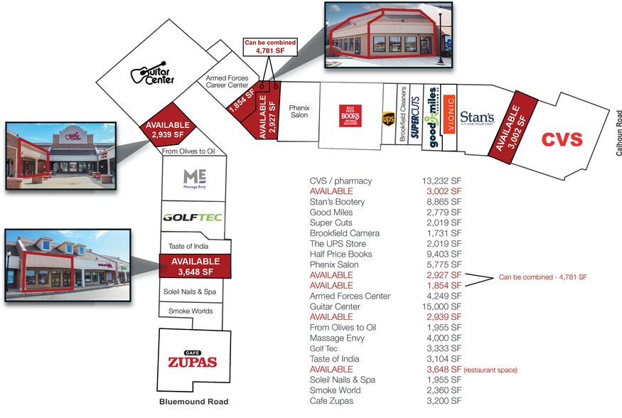 Le Plaza est un centre commercial très recherché et recherché qui se trouve sur le corridor très fréquenté de Bluemound Road, à quelques minutes de l'I-94 à Brookfield, au Wisconsin. Les locataires clés comprennent CVS/Pharmacy, Guitar Center et Half Price Books. Le nouveau café Zupas et des améliorations de façade seront apportées en 2024.Le Plaza est situé à l'angle sud-est des chemins Bluemound et Calhoun.