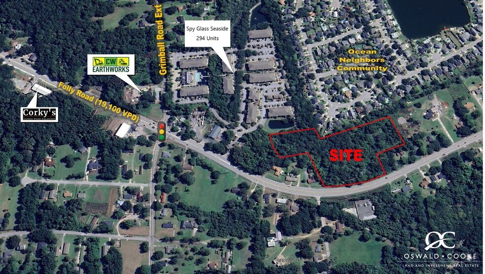 Oswald Cooke & Associates is pleased to present 7.63 acres of prime raw land for sale along Folly Road in Charleston, South Carolina. Located just three miles from Folly Beach, the property benefits from strong traffic exposure with an average daily traffic count of approximately 19,100 vehicles per day. The site offers excellent visibility and direct access from Folly Road, along with a secondary point of ingress and egress through the adjacent Spy Glass Seaside Apartment Complex. The property is positioned within a dense and growing trade area, with more than 43,700 residents within a five-mile radius and projected population growth of approximately 6.6% by 2029. Zoned PUD - Limited Business, the site allows for a variety of commercial development opportunities. Surrounding retailers include national and regional brands such as Harris Teeter, Publix, Walmart, Food Lion, Ace Hardware, The Great Greek, Exxon, and South Carolina Federal Credit Union, among many others.