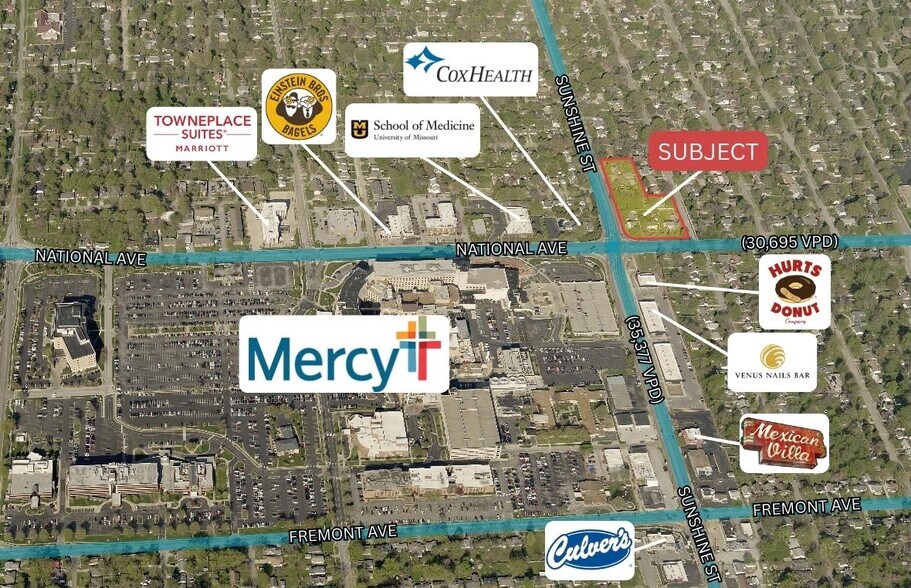 This property is located in one of the most strategic locations of Springfield at the corner of National and Sunshine. Across from Mercy Hospital — one of Springfield's major employment and visitation drivers — offering prime exposure to steady, high-quality traffic. Many neighboring businesses and organizations such as Cox Health, University of Missouri School of Medicine, TownPlace Suites, Hurts Donut Company, and many others surround the property.
