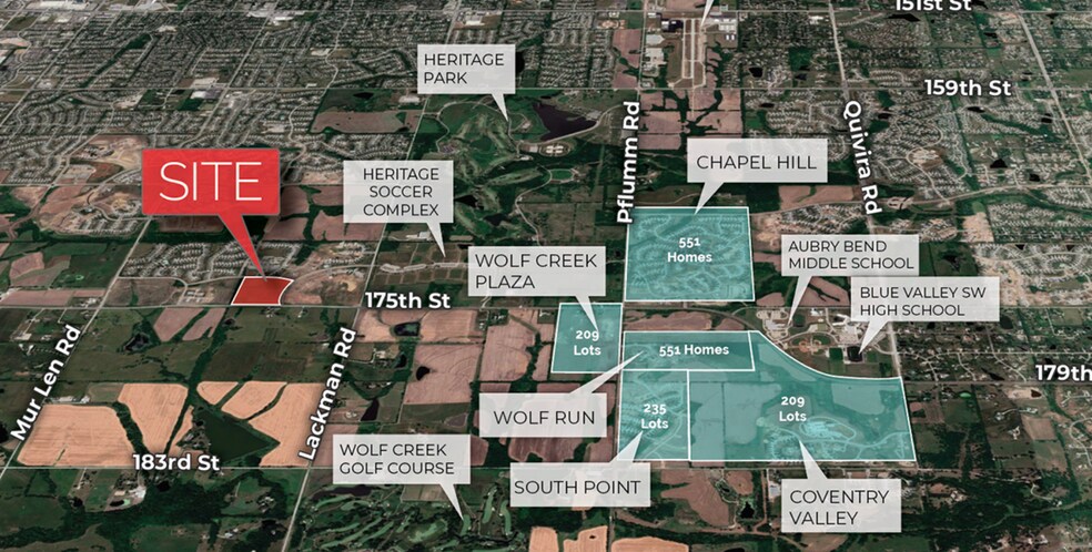 The property consists of a 22.96-acre residential development site located in the fast-growing South Johnson County area, offering an exceptional opportunity for expansion in a highly desirable corridor. Nestled at 175th Street and Black Bob Road, the land sits just west of the Overland Park Arboretum and Botanical Gardens and near the expansive 1,238-acre Heritage Park, providing a scenic and amenity-rich environment. The site is well-suited for multifamily, townhome, adult-active, or senior-living development, benefiting from its proximity to GRATA Development’s Boulder Hills community, an emerging new-homes neighborhood in Olathe with prices ranging from the upper $400s to the $600s. Zoned RP-3 for residential low-density multifamily use, the property already has utilities to the site and a shared road agreement in place, streamlining future development. Pricing is available upon request.