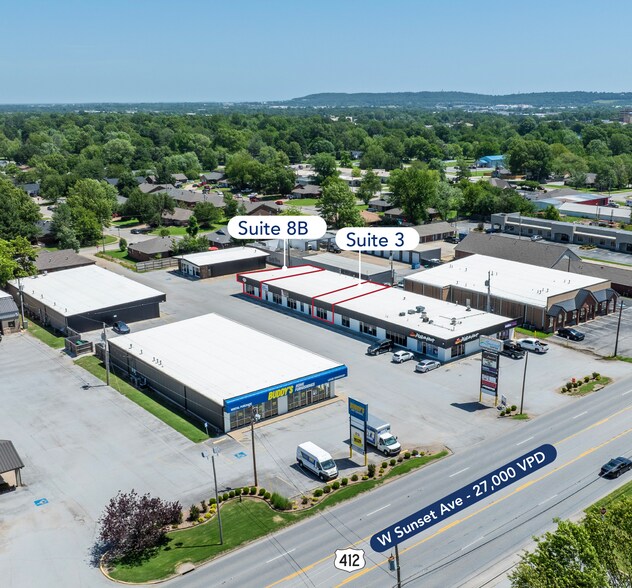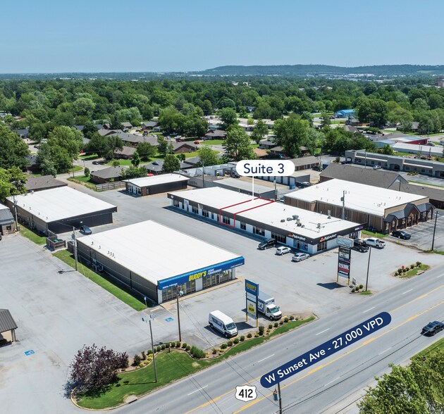 Entire Property has New Roofs and Newly Painted Exterior. Newly renovated bathroom. Frontage on Sunset Ave (HWY 412) with Easy Access to I-49 and HWY 71B. Ample Parking for Customers and Employees. High traffic area ensuring accessibility for potential customers (27,000 VPD). Proximity to major retailers such as Walmart Neighborhood Market, Harps, Walgreens, and various other retailers, restaurants, and businesses
