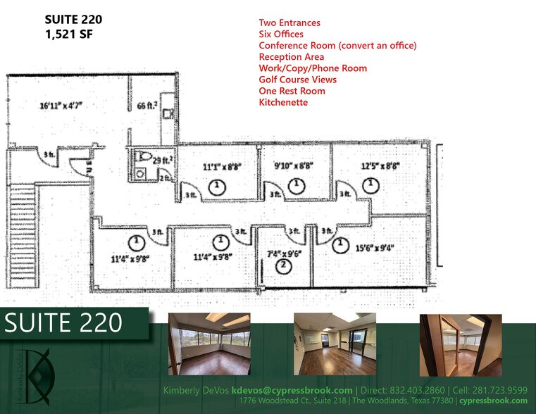 Five Offices Three Workstation Areas Conference Room (convert an office) Work/Copy Room Phone Room Storage Room Golf Course Views Two Rest Rooms Kitchen/Break Room