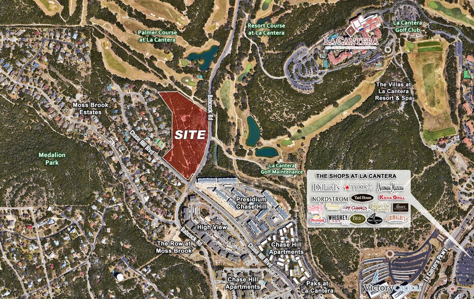 Excellent emplacement sur le coin dur du chemin Babcock et du boulevard Chase Hill. À moins d'un mille des boutiques de La Cantera et à moins de 2 milles du centre commercial The Rim. Excellentes vues.