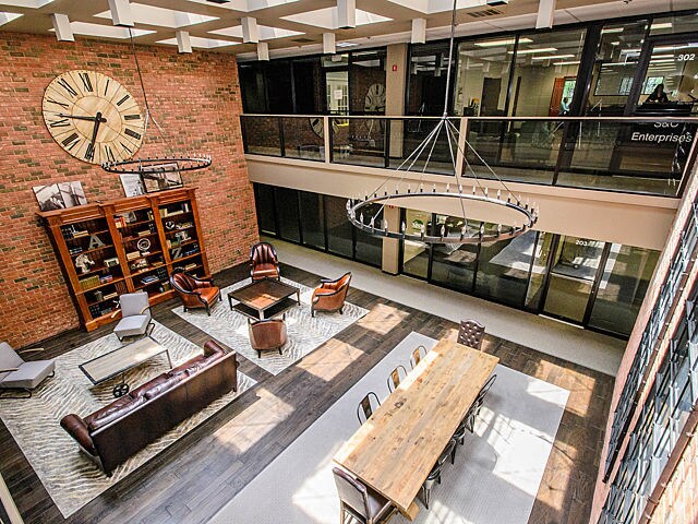 Édifice à bureaux de deux étages avec stationnement au rez-de-chaussée. Atrium rénové.
