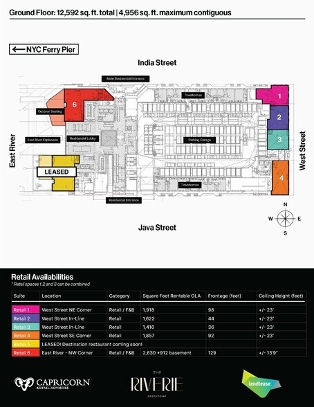 Faits saillants du projet Le commerce de détail de The Riverie fait partie d'une toute nouvelle communauté résidentielle de 834 logements à deux tours située sur 2,6 acres. Ce nouveau développement offre une vue imprenable sur les toits de Manhattan d'un côté et s'inscrit dans l'ambiance charmante et intime du quartier de Greenpoint de l'autre. Un total de 12 592 pieds carrés d'espace commercial est disponible, avec des subdivisions potentielles allant de 1 400 à 4 956 pieds carrés. Les hauteurs du sol au plafond varient de 13 à 23 pieds. Deux espaces donnant sur l'esplanade d'East River offrent une vue imprenable sur la ligne d'horizon de Manhattan et une possibilité de terrasse extérieure accessoire, idéale pour les exploitants de concepts de restauration et de boissons de destination. Le Riverie est situé à côté de l'embarcadère des ferries de Greenpoint NYC, qui permet une liaison facile de 15 minutes vers Midtown Manhattan, et à seulement 5 minutes à pied du métro G de New York à Greenpoint Av. Taille de l'espace : Rez-de-chaussée : 12 592 pieds carrés louables totaux (divisibles) avec des subdivisions potentielles allant de 1 400 à 4 956 pieds carrés. Façades : Front de mer East River, Inde, rue Java et West