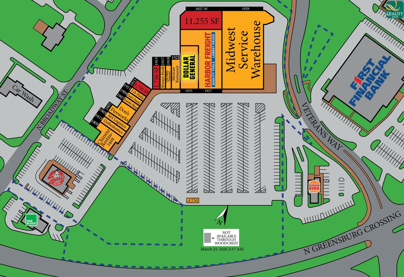 Greensburg Crossing est un centre commercial d'environ 98 000 pi2 situé au cœur de la ville de Greensburg, dans le couloir des centres commerciaux du comté de Decatur, dans l'Indiana — un quartier en pleine croissance. La propriété est idéale pour les commerces de détail, les bureaux ou les locataires médicaux. Greensburg Crossing abrite des locataires commerciaux nationaux et locaux. Il est doté d'une excellente signalisation en bordure de route et d'un grand terrain de stationnement. Les suites commerciales de ce centre sont disponibles à la location pour n'importe quoi, des vitrines de magasins traditionnels et des restaurants aux bureaux en passant par les fournisseurs de services médicaux ou autres fournisseurs de services professionnels. Woodcrest Capital accueille dans ses centres les entreprises qui s'y sont implantées pour la première fois et les franchises avec des contrats de location faciles à lire et des conditions souples tout en étant suffisamment sophistiqués pour plaire au plus grand des locataires de crédit nationaux. En tant qu'entreprise familiale avec plus de 40 ans d'expérience dans l'immobilier commercial, Woodcrest possède et exploite tout, des centres de classe A dans les quartiers les plus fréquentés aux centres en difficulté qu'elle réhabilite dans les communautés rurales en difficulté. Appelez-nous dès aujourd'hui pour trouver le bon emplacement pour votre entreprise, car nous avons généralement plusieurs occasions de vente au détail dans la région immédiate !