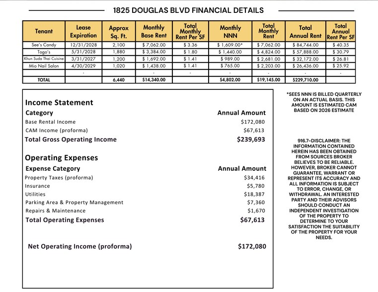 1825 Douglas Blvd offers a fully leased, stabilized NNN retail investment in one of East Roseville’s most established shopping corridors. The ±6,440 SF multi-tenant building sits on a ±40,946 SF parcel within the Placer Center retail node and delivers predictable cash flow with minimal landlord responsibility. Current tenancy includes a strong mix of national, regional, and service-oriented users, providing income diversity and long-term durability. Offered at a 6.25% cap rate, this asset fits investors seeking steady yield backed by a proven retail location and affluent consumer base.