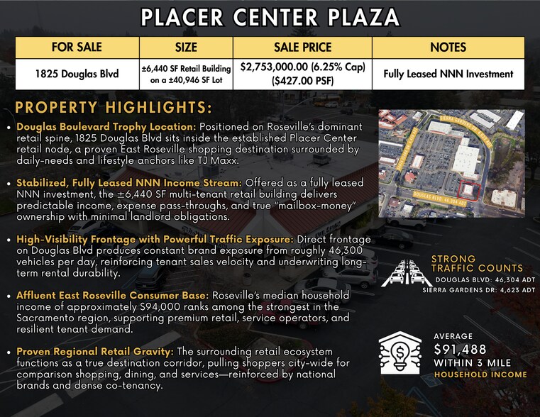 - Positioned along Douglas Blvd, Roseville’s dominant retail corridor with ±46,300 vehicles per day